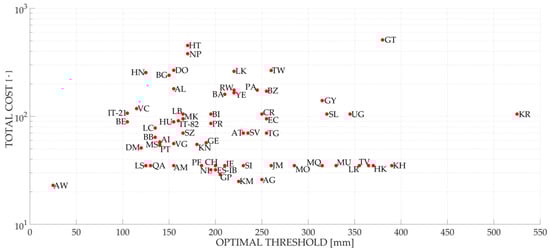 The optimal thresholds for every country object of study obtained using a false alarm cost equal to 1 and a missed alarm cost equal to 5 compared to the total rainfall of the country: The results refer to a 48-h aggregation interval. The countries naming follow ISO 3166.