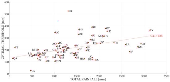 It was, therefore, decided to analyze the possible relationship between optimal threshold and mean annual rainfall of the country object of study, with the aim to calibrate the methodology with a site-specific parameter. This total rainfall amount (Figure A2 reported in Appendix A) was calculated using 10 years of GPCC (Global Precipitation Climatology Centre) “Monitoring product” [30] with a 1° resolution. The “Monitoring product” is a monthly global data which is available about 2 months after the end of the month which it refers to. About 7000–9000 stations contribute to this dataset. The “Monitoring product” is recommended by GPCC to be used for applications that need high-quality gridded measures of rainfall.