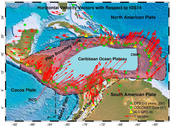 The Caribbean region is one of the earliest regions worldwide to employ Global Positioning System (GPS) for geological hazard studies. Due to its active tectonic and tropical environment, the Caribbean region is rife with natural hazards, such as earthquakes, volcanoes, landslides, flooding, tsunamis, hurricanes, and coastal erosions. GPS stations were installed in the Caribbean region since the middle of the 1980s for studying plate motions [1,2,3,4], almost one decade earlier than the full operation of GPS in 1995. The Caribbean region, as defined by this study, comprises the Caribbean Sea and its surrounding islands, including Central America to the west, the Greater Antilles to the north, the Lesser Antilles to the east, and parts of adjacent South America to the south (Figure 1). The tectonic entity that we refer to as the “Caribbean plate” comprises the Caribbean Ocean Plateau and the Plate Boundary Zones (PBZs) between the Caribbean Ocean Plateau and its neighbor tectonic plates, including the North American plate to the north, the North Andes plate to the south, the South American plate to the southeast and east, and the Cocos plate and Nazca plate to the west. Figure 1 depicts the PBZs outlined based on the early concept of Caribbean PBZs proposed by Burke and Mann [5,6]. The plate boundaries are defined by Bird [7] and the GPS-derived site velocities obtained from this study. The width of PBZs varies from approximately 200 km in the western PBZ to over 600 km in the eastern PBZ. The Caribbean Ocean Plateau is often regarded as the internal and stable portion of the Caribbean plate. The PBZs surrounding the interior of the Caribbean plate are comprised of numerous microplates that have recently garnered much attention from the scientific and politico-economic communities due to the hazard risks posed to the surrounding populated island countries [8,9,10,11,12,13].