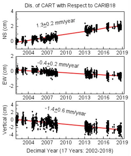 Figure 3 illustrates the observational history and data continuity of 16 among these 18 reference stations utilized to realize CARIB18. All reference stations have a history of over five years except two COCONET stations: CN29 and CN35. The three-component positional time series of the other two reference stations, CART and CN11, are illustrated in Figure 4 and Figure 5, respectively. CART is a long history (2002–2018) GPS station operated by the Geographic Institute Agustín Codazzi of Colombia (IGAC). CART is kept as a reference station because of its critical geographic location, lying on the continental shelf of South America plate, and filling a large gap of the reference network in the south-west PBZ. CART is not considerably affected by the thrust of the North Andes plate and the Nazca plate towards the Caribbean plate. All other nearby stations in the southwestern PBZ are significantly affected by the thrust of the two tectonic plates as shown in Figure 2a. Figure 6 illustrates the three-component displacement time series (CARIB18) of another long-term reference station CRO1 (2002–2018). CRO1 is located on St. Croix Island and retains a slightly larger vertical velocity (-1.9 mm/year) compared to other reference stations. A closely spaced permanent GPS station (VIKH) on St. Croix recorded an identical site velocity with CRO1. The slight subsidence recorded by CRO1 may imply minor relative tectonic motions between St. Croix Island and the stable portion of the Caribbean plate.