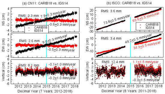 (a) A comparison of the displacement time series of CN11 with respect to CARIB18 and IGS14; (b) a comparison of the displacement time series of ISCO with respect to CARIB18 and IGS14. The root-mean-square (RMS) of the displacements is calculated from the detrended PPP daily solutions.