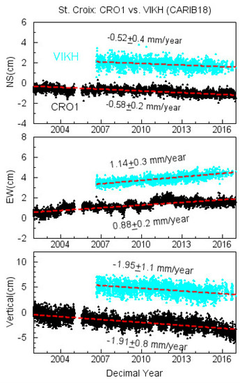 Three-component site velocities with respect to CARIB18 recorded by two permanent GPS stations (CRO1 and VIKH) on St. Croix island. The distance between these two stations is approximately 23 km.