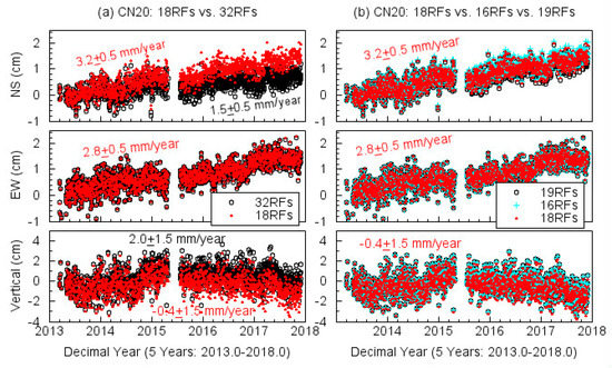 Plots depicting the effect of geometry of reference stations to the stability of the regional reference frame. COCONET station CN20 is located on Bocas Island in Panama (see Figure 2a). (a) The three-component displacement time series with respect to the initial reference frame realized by 32 reference stations (Figure 2a) and 18 reference stations (CARIB18, Figure 2b); (b) the three-component displacement time series with respect to reference frames realized by 18 reference stations (CARIB18, Figure 2b), 16 reference stations (removing RDON and SVGB from these 18 reference stations), and 19 reference stations (adding CN20 to these 18 reference stations).
