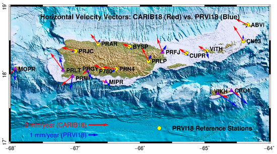 Figure 8 depicts the horizontal velocity vectors of those PRVI GPS stations (>5 years) with respect to CARIB18 (red) and PRVI18 (blue). The magnitudes and directions of the velocity vectors with respect to PRVI18 clearly indicate that those sites (PRMI, PRLT, PRGY) at the southwest corner of the Puerto Rico main island experience substantially larger motions compared to other stations. The horizontal velocities of other GPS stations are at a level of below 0.5 mm/year. However, the horizontal velocities of PRMI and PRLT are at the level of 1.5 to 2 mm/year. PRMI moves southwest against the PRVI block and PRLT moves to the northwest. PRMI is located on Magueyes Island, a small island 2 km south to the southern boundary of Lajas Valley, which is a 30-km-long east–west trending depression zone bounded by hills on its northern and southern edges. This area has the most frequent onshore microseismicity in the PRVI region [50]. Previous researchers have recognized possible Quaternary fault controls for the Lajas Valley on the basis of geomorphology and seismic reflection profiles [51,52]. The velocity anomalies (both magnitude and direction) at PRMI and PRLT confirms ongoing faulting activities within the Lajas Valley. It appears that the Lajas Valley currently experiences a north–south direction extension (1.5 mm/year) and minor right-lateral strike slip. However, the faulting movements are not so obvious with respect to CARIB18 since all stations in the PRVI region retain a horizontal velocity of approximately 1.5 to 2 mm/year. PRVI18 is definitely a better reference frame than CARIB18 for precisely tracking faulting activities and for assessing present seismic risk within the PRVI region.