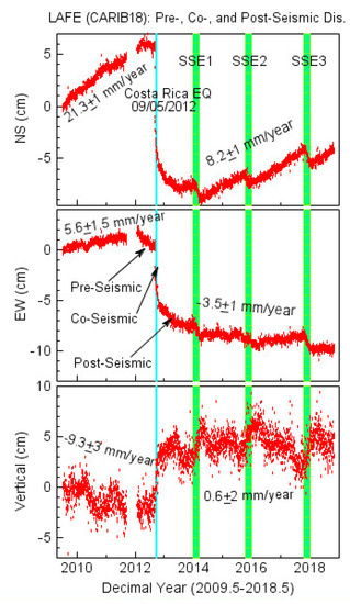 Plots illustrating the application of CARIB18 in delineating pre-seismic, co-seismic, and post-seismic ground deformation associated with the 5 September 2012 Nicoya, Costa Rico earthquake (Mw 7.6), and slow-slip events (SSE). LAFE is located in the small town of Paquera on the Nicoya Peninsula, Costa Rica.