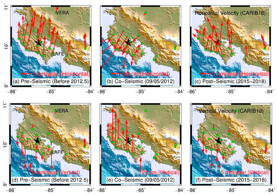 Maps illustrating the application of CARIB18 in depicting spatial patterns of pre-seismic, co-seismic, and post-seismic ground surface deformation caused by the Nicoya, Costa Rica earthquake (5 September 2012; Mw 7.6). (a) and (d): Horizontal and vertical velocity vectors at GPS stations on the Nicoya Peninsula before the 2012 earthquake; (b) and (e): Co-seismic displacements occurred during the day that earthquake happened; (c) and (f): Post-seismic velocity vectors since 2015. The co-seismic displacement is calculated by differencing the one-week average positions after the earthquake day (5 September 2012) and one-week average position before the earthquake day.