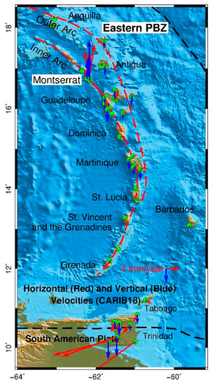 Volcanoes are distributed all over the Caribbean region. Most of the active volcanoes are located on the Lesser Antilles islands within the eastern PBZ and on the Central American Arc (CAVA) within the western PBZ. The Lesser Antilles has been described as a double island arc that is built largely by volcanism above a subduction zone [65]. CAVA is a chain of volcanoes which extends parallel to the Pacific coastline from Guatemala, El Salvador, Honduras, Nicaragua, Costa Rica, and down to northern Panama. Presently, the most active volcanos within the Caribbean region are the Fuego Volcano in Guatemala within the western PBZ and the Soufriere Hills Volcano (SHV) on Montserrat Island within the eastern PBZ. Fuego has erupted more than 60 times since 1524, making it Central America’s historically most active volcano [66]. The most recent disastrous eruption occurred on 3 June 2018, which was the deadliest eruption in Guatemala since 1929. Unfortunately, there are few long-term permanent GPS stations near the Fuego Volcano.