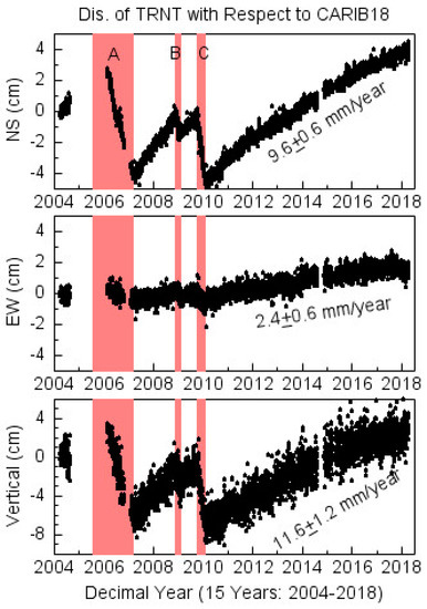 GPS recorded ground deformation associated with the volcanic activities of the Soufriere Hills Volcano on Montserrat since 2004. Shaded A, B, and C periods represent three eruption events. The marked velocity is the linear regression of the displacement time series from 2010 to 2018. TRNT is located about 6 km NNE from the mouth of the volcano (see Figure 14).