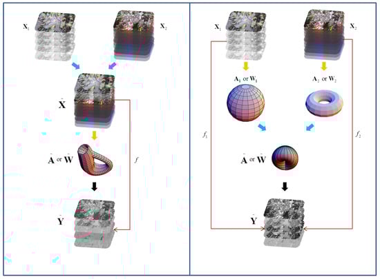 Frameworks of manifold learning fusion techniques. Left: the data alignment fusion; Right: the manifold alignment fusion. The blue arrow indicates the fusion step. The yellow arrow indicates where the modeling of manifold takes place. The black arrow indicates the feature extraction. : ith data source; or : mathematical modeling of manifolds; : fused feature; : the learned projection. : a fusion of certain form.