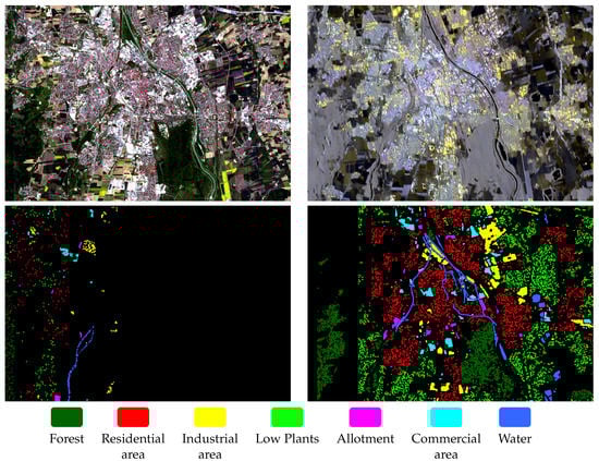 In the Berlin data set, the hyperspectral image is a synthetic spaceborne EnMAP scene synthesized from airborne HyMap data. It has a size of 817 by 220 pixels, a 30-m ground sampling distance (GSD), and 244 spectral bands ranging from 400 nm to 2500 nm [85]. The dual-channel PolSAR data is a VH-VV polarized Sentinel-1 data acquired in interferometric wide swath mode. The Sentinel-1 SLC data is preprocessed using ESA SNAP toolbox and filtered by a non-local mean filter [86]. The PolSAR data has a GSD of 13 m and a size of 1723 by 476 pixels. The ground truth is a land use land cover map derived from Open Street Map (OSM) data [87]. The ground truth labels are spatially separated into a training data set and a testing data set shown in Figure 2. The details of the training and testing data sets are summarized in Table 2.