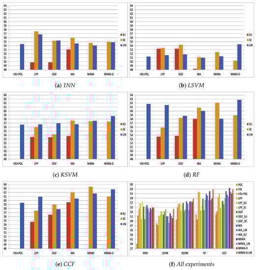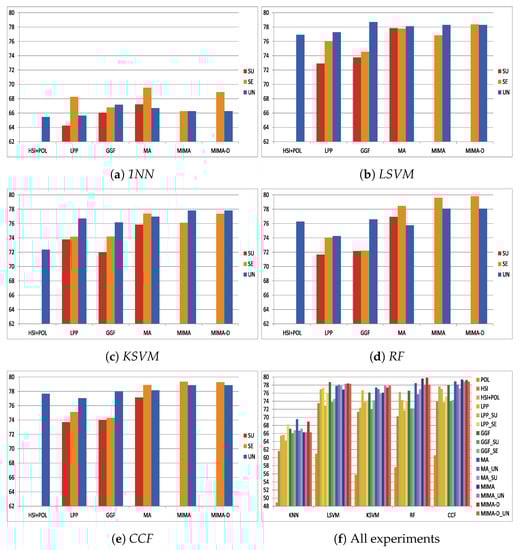 Comparison of the classification accuracies of different classifiers applied on the Berlin data set. Each chart is resulted from a corresponding classifier. The right bottom chart demonstrates all the overall accuracy resulted by applying five classifiers on every fused data achieved from the selected 16 algorithms. The y-axis report the overall accuracy in percentage (%). The ‘SU’, ‘SE’, and ‘UN’, represent supervised, semi-supervised, and unsupervised, respectively.