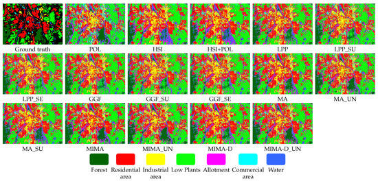 To carry out a comprehensive comparison of the fusion algorithms, in total 16 algorithms were implemented. Listed in Table 4, they are (1) PolSAR data only (POL), (2) hyperspectral image only (HSI), (3) feature stacking of hyperspectral and PolSAR data (HSI+POL), (4) data alignment using the original locality preserving projections (LPP) [52], (5) supervised version of LPP (LPP_SU), (6) semi-supervised version of LPP (LPP_SE), (7) the generalized graph-based fusion (GGF) [48], (8) supervised version of GGF (GGF_SU), (9) semi-supervised version of GGF (GGF_SE), (10) manifold alignment (MA) [36,44], (11) unsupervised version of MA (MA_UN), (12) supervised version of MA (MA_SU), (13) MAPPER-Induced manifold alignment with first two principal components as filter functions (MIMA) [53], (14) unsupervised MIMA (MIMA_UN), (15) MIMA with local density as filter function (MIMA-D), and (16) unsupervised MIMA with local density as filter function (MIMA-D_UN).