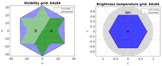 Figure 2 shows the MIRAS reciprocal grids for . The fundamental hexagon is depicted in blue in both domains, the green star in () includes all measured visibility points and their conjugate ones; and the extension of the () grid to the unit circle is drawn in gray. Both fundamental hexagons have the same number of points, in this case equal to . A larger value just enlarges the () hexagon while keeping the star shape identical, and provides a thicker grid in () [8]. The fundamental hexagon in this domain has a fixed side, independent of the number of points, equal to where d is defined in the previous paragraph. This hexagon always falls inside the unit circle if .