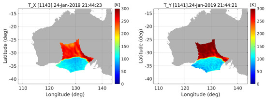 Exploiting the processing capabilities of this software, the proposed algorithm was tested relying on a set of real MIRAS measurements. Specifically, a SMOS orbit was processed in full polarimetric mode (Section 2.8) using the all-LICEF calibration approach [12]. Figure 3 shows the retrieved geo-located images at X- and Y-polarizations corresponding to a single snapshot acquired on 24 January 2019 at 21:44 UTC, when the satellite was passing over the coast of Australia during an ascending orbit. The Blackman window is applied using the methods in Section 2.7.