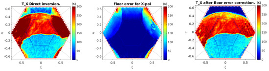 Figure 5 shows the X-polarization case with both terms of Equation (10) drawn separately as well as the difference between them, which is the final reconstructed image. The left panel shows the result of multiplying the calibrated visibility by the inverse of the G-matrix (first term of Equation (10), the center panel is the floor error and the right panel the corrected image. As expected, the floor error is very small in regions where the earth aliases do not enter into the hexagon, which is the so-called “extended alias-free field of view”, nominally used in SMOS images (as in the geo-located images of Figure 3). Most of the artifacts of the raw image at the left are effectively removed in the corrected one. Specifically, strong improvement in the image reconstruction is found in the sky area as well as in both the bottom left and right strips. Contrarily, much lower effects are exhibited in the extended alias-free field of view, where the floor error is minimum. Later it will be shown that there is indeed a small improvement in this area. Apodization of the corrected image with a Blackman window, using the procedure of Section 2.7, provides the final result seen at the left of Figure 4.