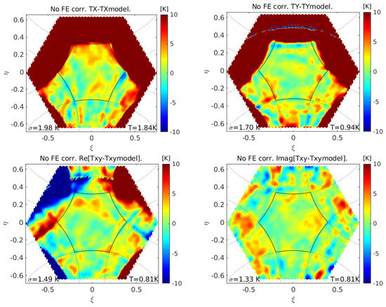 Figure 6 shows the bias with respect to the model of all snapshots ranging in a latitudinal range of [] over the Pacific ocean in an ascending orbit of 28 January 2011 (chosen quite often for these kinds of analysis by the SMOS Level 1 team). In the area imaging the sky, the model is the standard SMOS Galaxy map. All four polarimetric products are included in Figure 6, brightness temperature at X and Y polarizations and real and imaginary parts of the complex brightness temperature. Basic statistics, referring to the alias-free field of view only, are shown at the bottom of each panel of Figure 6. Namely, spatial standard deviations and mean values are indicated by and T respectively. The relatively large negative bias in the Y-pol image may be due to poor modeling at high incident angles. In any case, these residual error images are compatible with the ones obtained with the SMOS Level-1 Operational Processor and have similar statistics.