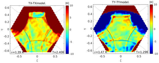 Figure 4 shows the brightness temperatures of same snapshot in the () plane. Clearly, the image reconstruction algorithm is able to capture all the scene features in the whole hexagon, not only in the alias-free field of view. Ocean, land and sky areas are clearly distinguished and, at this scale, aliases impact is minor. Differences between and are due to the stronger increments associated to both the sea/land and Earth/sky transitions with respect to . The model used to cancel the floor error [ in Equation (10)] consists of a constant value in land zones (258 K for X-pol and 285 K for Y-pol), specular reflection in ocean areas using Fresnel reflection coefficients with climatology salinity and temperature [22], a constant 8.5K to account for atmospheric effects and the L-Band sky and Galaxy map available as auxiliary file in the SMOS data base.