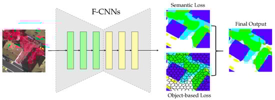 Illustration of the proposed object-based deep learning framework. The input image is fed to a F-CNN architecture with encoding (green) and decoding (yellow) layers. During the pixel-based optimization procedure, the semantic loss is calculated by comparing the network output with the reference data, while the object-based loss constrains the semantic labels to be the same with the dominant label inside each superpixel. The two losses are then combined together to produce the final segmentation map.