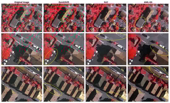 Comparing image objects derived from the Quickshift and SLIC algorithms with the proposed AML object-based approach (AML-QS). Image crops from the Vaihingen dataset are presented. Yellow dashed line: indicative areas where the proposed approach results into more semantically merged objects and more clear, accurate edges and boundaries.