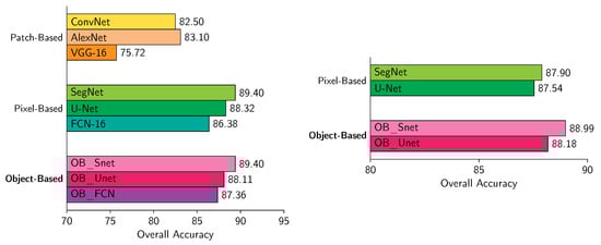 The developed object-based learning frameworks (i.e., OB_Snet, OB_Unet and OB_FCN) were applied to the Vaihingen dataset and compared with the performance of the patch-based (i.e., ConvNet, AlexNet and VGG-16) and pixel-based fully-convolutional (i.e., SegNet, U-Net and FCN-16) networks. The quantitative results regarding the calculated Overall Accuracy rates are presented in Figure 3 (left). The two object-based frameworks that resulted in higher accuracy rates (i.e., OB_Snet and OB_Unet) in Vaihingen were also applied to the Postdam dataset (Figure 3, right) as well. More specifically: