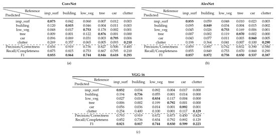 Resulting Confusion Matrices for ConvNet, AlexNet and VGG-16 frameworks on the Vaihingen dataset.