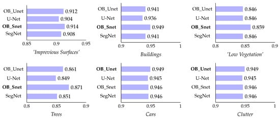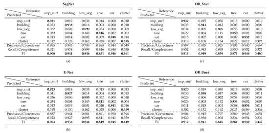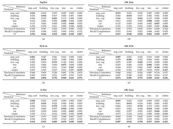 Moreover, as far as the Vaihingen dataset is concerned, the recall rates of Impervious_Surfaces and Cars were ameliorated (see also Figure 5) for all object-based models (OB_Snet, OB_FCN, and OB_Unet). In addition, the object-based OB_FCN network outperformed the standard FCN-16 by 1% in terms of overall accuracy (see also Figure 3) with all classes except Clutter achieving higher F1 rates.