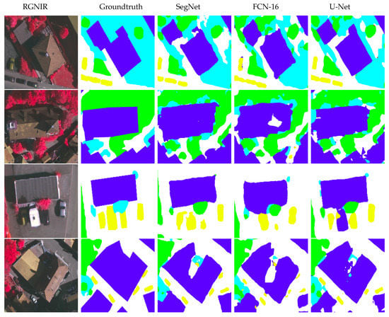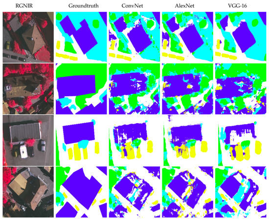For the qualitative evaluation, three figures demonstrating the results of the patch-based (Figure 8: ConvNet, AlexNet and VGG-16), the fully convolutional pixel-based (Figure 9: SegNet, U-Net and FCN-16) and the developed object-based deep learning frameworks (Figure 10: OB_Snet, OB_Unet and OB_FCN) on the Vaihingen dataset are presented.