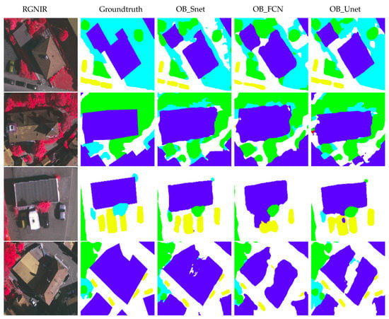 Experimental results from the developed OB_Snet, OB_FCN and OB_Unet networks on indicative regions from the Vaihingen dataset. Along with a false color composite (R-G-NIR), the corresponding ground truth is presented as well (White, Impervious_Surfaces; Blue, Buildings; Light Blue, Low_Vegetation; Green, Trees; Yellow, Cars; Red, Clutter).
