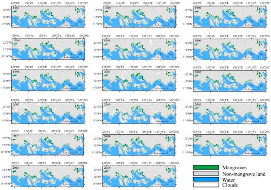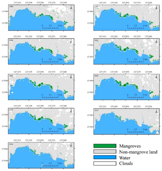 Pre-processing was done in preparation for image classification. The different Landsat images came from different sensors, therefore, various radiometric corrections and geometric corrections were applied [20]. However, atmospheric corrections were not applied to the time-series images in this study, since we employed a post-classification change analysis strategy where the atmospheric differences of different sensors at different times can be reduced after the classification of each image [20]. Images from Landsat 8 OLI were stacked in layers followed by the creation of subsets for each image. Ground control points (GCP) were collected manually for all the time-series images to conduct co-registration to make sure all the images at different time were under the same georeferenced system [20,21]. However, clouds were not removed in this study due to technical difficulty, instead, we identify clouds as a special class during the classification. Cloud contamination in Landsat images still remains a challenging issue, especially in a tropical region of the Philippines [22]. Therefore, we tried to select those images without clouds in our study areas. There were still some small areas of clouds in our selected images, but mostly they are not covering the mangrove forests, which can be seen in Figure 2 and Figure 3. These clouds only occurred over the non-mangrove areas.