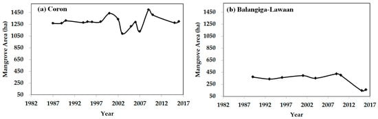 Further analysis analyzed the expansion and shrinkage trends of the mangrove area coverage of the two study areas. The growth rate per year was calculated between the years 1989 to 2010 when the positive trend was relatively consistent, while the reduction rate was from 2010 to 2016 as both mangrove areas showed significant decline during this time. The growth rate at Coron was 6.18 ha per year, while the rate at Balangiga-Lawaan was 1.47 ha per year. Conversely, the reduction rates were −19.02 ha per year and −40.22 ha per year, respectively. These results suggest that the Coron mangrove areas expanded more than the Balangiga-Lawaan mangroves over the same epoch. The reduction rates indicate that the Coron mangroves are more resistant from disturbances than the Balangiga-Lawaan mangroves. Coron has a more diverse species composition as compared to Balangiga-Lawaan. Coron’s mangrove zonation may have been better than that of the fringing mangroves of Balangiga-Lawaan. A recent study reported that there were mangrove plantations in the Eastern Samar coastal municipalities, mostly Rhizophora species planted seaward that were severely damaged. Hence, the resistance from strong winds and waves may be relatively low [18].