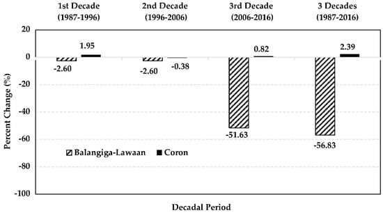 Figure 5 shows the results of the change detection statistics considering threee periods: 1987–1996, 1996–2006 and 2006–2016. Although fluctuations were observed in Figure 4, especially for Coron, the changes at the decadal time scale in the two study areas indicate a different temporal pattern compared to that of the annual scale. Generally, the Coron mangroves showed an increase in areal extent while the Balangiga-Lawaan mangroves areal extent decreased in all three time periods. It can be noted that although the Coron mangrove area expansion is slow, the mangroves in these areas are relatively stable amidst disturbances that occurred in the past 30 years. However, Balangiga-Lawaan continued to decline, aggravated by tropical cyclone disturbances in the later period. The difference in the geographic location of the two study sites may also further explain the level of vulnerabilities against tropical cyclones. Balangiga-Lawaan lies on the open Pacific Ocean, where the majority of typhoons form, and have a higher chance of making landfall on the eastern boarder of the Philippines. While Coron is situated on the western side of the Philippines, typhoons that come from the eastern side usually do not have sustained winds to further impact the islands at the western side of the country.
