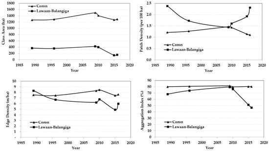 First, change detection analyses divided in three decades were compared. Change detection was applied in three time periods for the study areas: (1) Coron—1987–1996, 1996–2006 and 2006–2016; and (2) Balangiga-Lawaan—1989–1996, 1996–2004 and 2004–2016. Second, landscape metrics are often used for landscape ecology studies to better understand the ecosystem dynamics in a certain study area. For this study, four landscape metrics, Class Area (CA), Patch Density (PD), Edge Density (ED) and Aggregation Index (AI), are used to further examine and quantify the dynamic changes of the two mangrove areas over time [27]. CA calculates the area in hectares per classes on a landscape. It also provides information on the areal extent changes of the mangrove classes for Coron and Balangiga-Lawaan. PD provides information of how many patches contained per 100 hectare of mangrove areas. ED computes the number of meters per hectare (m/ha). Edges of the mangrove cover tend to be the most vulnerable part of the landscape as it directly faces the disturbances from natural and human causes. Since many organisms and rural communities are dependent on the natural resources of the mangrove forests, edge effects and fragmentation due to disturbances can be possible indicators of future impacts. AI provides information about the possible growth behavior of mangrove areas. Values are given as a percentage, where 100% means that the mangrove area is highly aggregated. For this study, calculation of the following landscape metrics was done by using the Fragstats 4.2 software [28]. These calculations were done for the years that were common for both study areas—1989, 1996, 2009, 2010, 2015 and 2016.