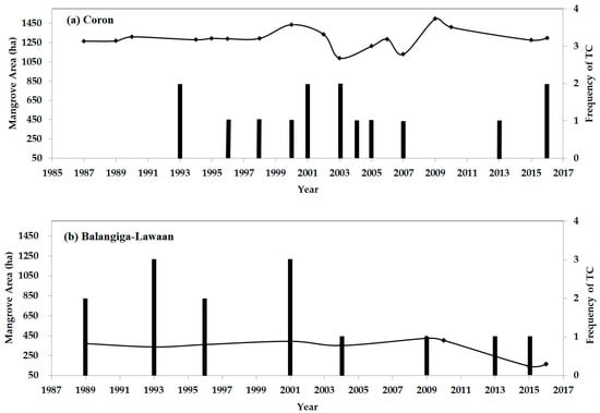 Super typhoon Haiyan in 2013 had a significant impact on the mangrove areal extent of the two study areas; to put this context, the historical patterns of tropical cyclones from 1987 to 2016 was also examined. The yearly frequency of tropical cyclones was compared with the areal changes of mangroves, shown in Figure 7. Generally, it can be observed that the correlation is not very significant. The frequency of typhoons can reduce the mangrove areal extent, especially during the years of 1993, 2001, 2003 and 2013 at Coron, and 1989, 2001 and 2013 in Balangiga-Lawaan. However, some exceptions were observed, for instance, 1996, 2004 and 2005 in Coron, and 1996 in Balangiga-Lawaan, where the mangroves increased with the tropical cyclones’ occurrence. Nevertheless, three aspects should be well noted to understand the results in Figure 7. First, the intensity of the tropical cyclones was missing in the data of this study, which may be an important factor towards mangrove change. For instance, the super typhoon Haiyan in 2013 brought a significant decrease to the mangrove regions, although it was the only cyclone in 2013. Second, the exact time of tropical cyclones in each year were also missing which inhibited the ordering of satellite images and tropical cyclones in each year. Thus, the impacts of tropical cyclones may be in the same year or the next year. Third, the impacts of human protection of the mangroves cannot be shown in Figure 7, which can also be an important factor towards the increase or decrease of mangroves. A more detailed discussion of the driving factors of mangroves changes in the Philippines was provided in Section 4.
