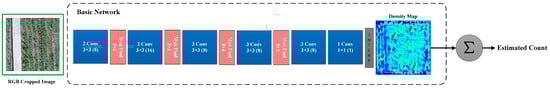 An overview of the proposed Basic Network method is shown in Figure 2. Its input is the UAV image, and the output is a density map describing the distribution of rice seedlings. It is worth mentioning that our Basic Network estimates the distribution of rice seedlings required for seedling counting using an architectural design similar to the well-known VGG-16 [36] network. The VGG-16 is a powerful network originally trained for the purpose of object classification in computer vision. Recently, an increasing number of studies have applied VGG-16 networks to other research domains, such as saliency prediction [37] and object segmentation [38], as the base feature extractor. However, an inevitable disadvantage of the original VGG-16 is that the number of parameters that need to be calculated is very large. For example, the convolutional layers of VGG-16 require 30.69 billion floating-point operations for a single pass over a single image at 224 × 224 resolution [25]. To reduce the number of floating-point operations and improve the efficiency of the model for rice seedling counting, we simplified the original VGG-16 network. Specifically, the number of convolution kernels per layer was greatly reduced, the stride of the fourth max-pool layer was set to 1, the fifth pooling layer was replaced by a 1 × 1 convolutional layer, and each convolutional layer is followed by a rectified linear unit nonlinearity (ReLU). In addition, considering potential image classification problems, rice seedling density estimation requires per-pixel predictions, where a single discrete label is assigned to an entire image. We obtain these pixel-level predictions by removing the fully connected layers present in the original VGG-16 architecture, thereby rendering our network fully convolutional. These modifications enable our VGG-16-like network to make predictions at 1/8 times the input resolution. The corresponding density map can be obtained using the bilinear interpolation operation outlined in [26].