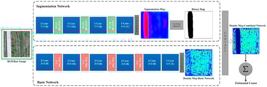 In the previous sub-section, we introduced the Basic Network for counting rice seedlings. For a static image of rice seedlings captured by UAV in situ, count accuracy cannot be improved further unless we manually crop the rice seedling area in the image. This is because there is less information about non-rice seedlings in the training set, which diminishes the ability of the trained Basic Network to distinguish between rice seedlings and non-rice seedlings. Therefore, vegetation resembling rice seedlings (shrubs and weeds, etc.) is likely to be recognized as rice seedlings by the Basic Network, with density values incorrectly assigned to these areas. Moreover, in the density map obtained using the Basic Network, some other areas such as houses, roads, etc. are also assigned low density values, which further reduces the accuracy of counting. To solve this problem, this sub-section introduces an improved version (Combined Network) with a Segmentation Network to accurately estimate the number of rice seedlings.