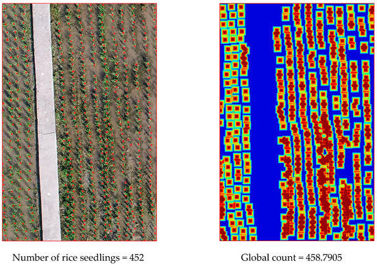 Rice is an important primary food that plays an essential role in providing nutrition to most of the world’s population, particularly in Asia [1,2,3]. Therefore, methods for estimating rice yield have received significant research attention. The number of rice seedlings per unit area (rice seedling density) is an important agronomic component. It is not only closely associated with yield, but also plays an important role in the determination of survival rate. From a breeding perspective, researchers are interested in breeding varieties, and the survival rate of rice seedlings can provide a benchmark for the selection of breeding materials. Thus, accurate determination of the number of rice seedlings is vital for estimating rice yield and is a key step in field phenotyping. In practice, counting rice seedlings still largely depends on manual human efforts. This is time-consuming and labor-intensive for researchers conducting large-scale field measurements. There is thus a pressing need to develop a fast, non-destructive, and reliable technique that can accurately calculate the number of rice seedlings in the field.