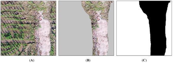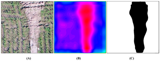 Segmentation map (B) predicted by the Segmentation Network on a cropped UAV image (A) and the corresponding binary map (C) calculated by Equation (1). The threshold range is fixed at [90, 265].