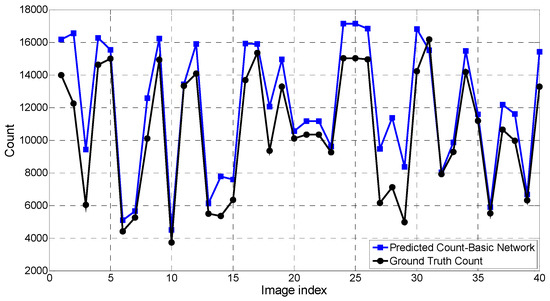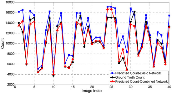 Figure 10 shows the results of three counts for each image in our RSC dataset, including the predicted counts obtained by the Combined Network, the predicted counts obtained by the Basic Network, and the ground truth counts which served as the baseline for the comparison. In most cases, the count predicted by the Combined Network was closer to the ground truth count than the count predicted by the Basic Network. However, we observed that in rare cases, the predicted count of the Combined Network was not as accurate as the Basic Network. For example, for the fifth image with a ground truth count of 14,994, the predicted count from the Combined Network was 14,244 with a MAE of 770, while the predicted count from the Basic Network was 15,541 with a MAE of only 547. Even so, the accuracy of the Combined Network in predicting the number of seedlings in the fifth image was still over 94%. Therefore, we suggest that the effectiveness of the Combined Network will be acceptable in most, if not all, real-world applications.