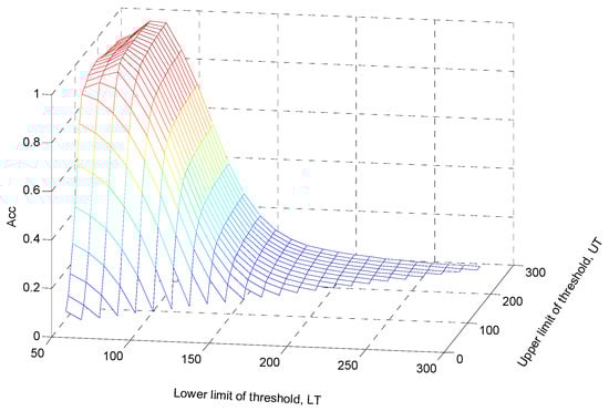 Performance of the Combined Network model under different intensity value threshold ranges. The X axis is the lower limit of the intensity value threshold range, the Y axis is the upper limit of the intensity value threshold range, and the Z axis is the accuracy of our proposed Combined Network for counting rice seedlings.