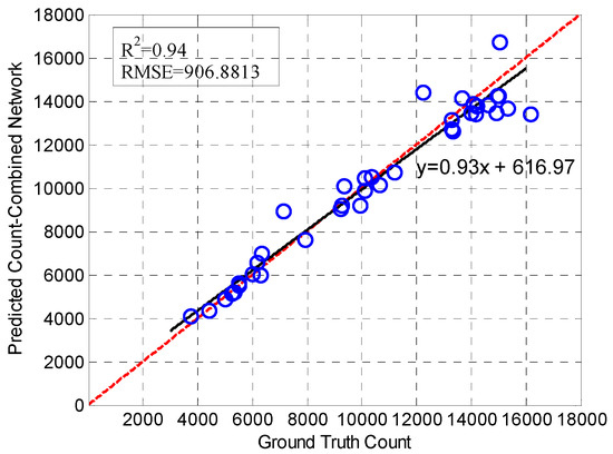 Figure 11 depicts the regression relationship between the ground truth count and the automatic count derived from the Combined Network. Compared to the Basic Network (Figure 7), the Combined Network model performed better at estimating the number of rice seedlings with R2 and RMSE of 0.94 and 906.8813, respectively. We can also observe from Figure 11 that the black regression line converges closely with the 1:1 dashed red line, which testifies once again that our Combined Network model can effectively solve the problem of in-field counting of rice seedlings.