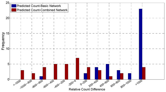 In sum, for a given image taken by a UAV, we can estimate the number of rice seedlings therein to a high degree of accuracy. Nevertheless, we have not explored the distribution of errors based on our proposed methods. An interesting question is “compared with the ground truth count, is our method overestimating or underestimating the number of seedlings?” or “in a single estimate, how many seedlings are overestimated (underestimated)?” Figure 12 presents histograms of count errors, where the height of each of blue (red) bar represents the frequency of occurrence of the proposed Basic Network (Combined Network) within a particular error range. The results suggest that overestimations occurred significantly more frequently in the Basic Network compared to the Combined Network, and it was common for the former network to overestimate by more than 1000 seedlings. The count error distribution in the Combined Network was relatively uniform, and substantive underestimation or overestimation (relative count difference < −1000 or >1000) did not occur frequently. These results further confirm that the Combined Network model, which amalgamates the Basic and Segmentation Networks, achieves comparable or better results compared to the Basic Network model in isolation.