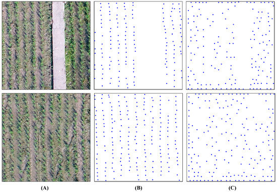 Examples of predicted rice seedling distribution maps extracted from the final density map: (A) cropped UAV images where rice seedlings are unevenly (upper image) and evenly (lower image) distributed; (B) ground truth rice seedling distribution map where the points represent rice seedlings; (C) predicted rice seedling distribution map extracted from the final density map using the k-NN algorithm.