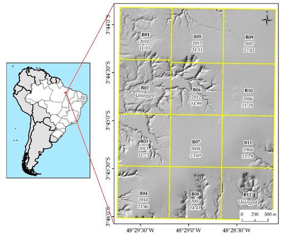 Location of the study area. The distribution of the blocks over the shaded relief of Cauaxi site (~1200 ha), year of logging, and harvested volume (m3 ha−1) are included.