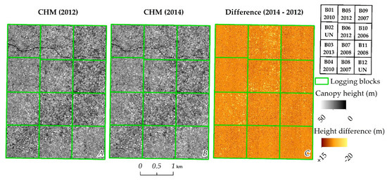 Both recent and earlier changes in forest height due to logging can be observed in the canopy height models for 2012 and 2014 (Figure 3A,B). The primary access road (in B01, B05, and B09) that crosses the area is also visible through the canopy (Figure 3A,B). Most of the large (up to 20 m) decreases in canopy height are found in the areas that were harvested between 2012 and 2014 (B03, B05, B06; Figure 3C), although small clusters of canopy height losses from canopy tree fall and branch fall events occurred in all blocks, regardless of logging history.