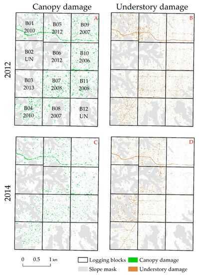 Canopy (panels A and C) and understory (panels B and D) damage for 2012 and 2014 LiDAR coverages in Cauaxi site. Block code and year of logging are shown in panel A.
