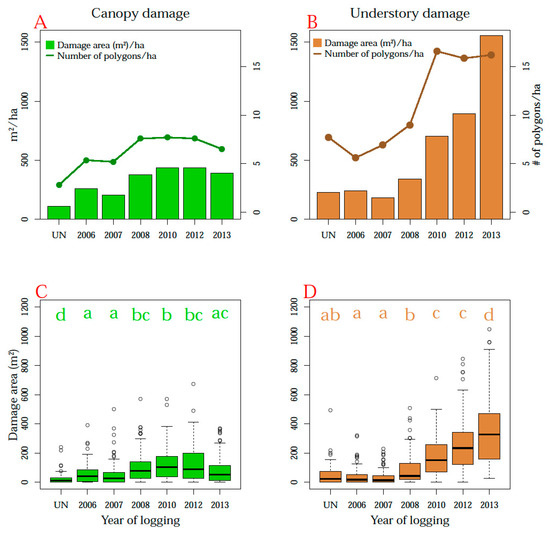 Top panels (A,B): canopy and understory damage per year of logging for 2014 LiDAR coverage. Bars show the total damaged area per hectare and lines represent the number of damage polygons per hectare (considering total available for each category, slope mask area excluded from estimates). Bottom panels (C,D): box-and-whisker plots of canopy and understory damage from the 0.25 ha samples at the logging treatments. Groups labelled with the same letter are not significantly different at confidence level of 99% (Wilcoxon test). Box heights correspond to the interquartile range, whiskers span up to 1.5 times the interquartile range, and the horizontal line corresponds to the median.