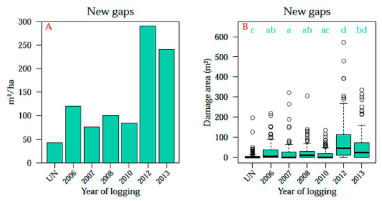 Area with new gaps between the two LiDAR acquisitions at the logging treatments (A) and distribution of new gaps from the 0.25 ha samples (B). In panel B, groups labelled with the same letter are not significantly different at the 99% confidence level (Wilcoxon test).