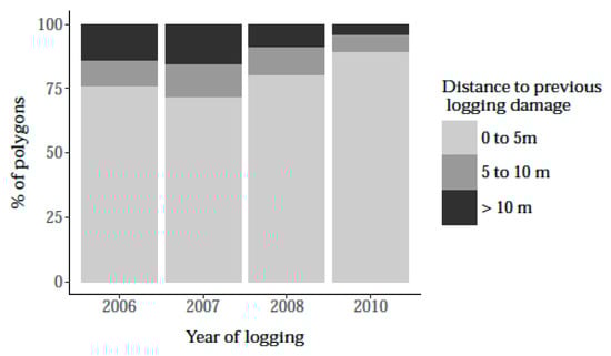 New canopy gaps were found to be highly clumped around logging-impacted areas (Figure 8). Using the understory damage mapped in 2012 as an indicator of logging impact, we found that 76% of new gaps that formed in areas logged in 2006 and 89% of new gaps that formed in areas logged in 2010 were within 5 m of previous logging damage. Furthermore, only 14% (2006) and 4% (2010) of new gap polygons were further than 10 m from understory damage areas (Figure 8). For this analysis, we considered the understory damage of the areas logged prior to the first LiDAR acquisition only.