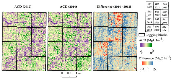 Above-ground carbon density for 2012 (A) and 2014 (B) and difference image (C) in Cauaxi site. The code and year of logging for each logging block are shown in the index map in the top right.