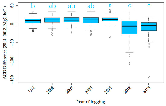Intact forest areas and areas logged between 2006 and 2010 presented slight biomass gains between 2012 and 2014. In the 100 selected samples for each logging treatment, we found 8.18 ± 0.93 (mean ± standard error) MgC ha−1 for intact and 10.53 ± 0.52 MgC ha−1 for logged forests (Figure 10). In contrast, recently logged areas (2012–2013) lost carbon (−10.35 ± 1.90 MgC ha−1), albeit with a higher range of variation. When we compared recently logged areas to older logging and intact forests, we found significant differences (p < 0.01; Wilcoxon Rank Sum test) in ACD (Figure 10). ACD changes in intact forest plots were not significantly different from the changes in areas logged in 2006, 2007, and 2008.